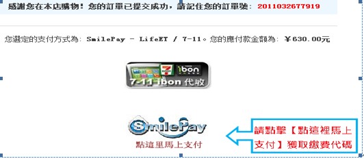 十一、提交訂單後,會出現一個繳費代碼以及訂單號碼,請點選【點這裡馬上支付】獲取繳費代碼