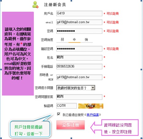 三、進入會員註冊頁面,請輸入您的資料,以下為註冊範例,請參考