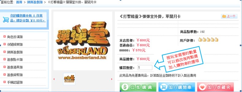六、請選擇您要購買的方案再點進去,以《打擊精靈》彈彈堂外掛,單開月卡為例,請注意商品庫存喔,如果庫存不夠請通知我們喔!