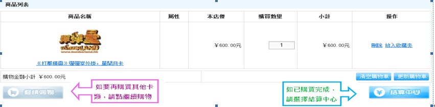 七、加入購物車後,如果已購買完成,請選擇結算中心,如要再購買其他卡類,請選擇繼續購物,我們此時已完成購物,所以點結算中心。